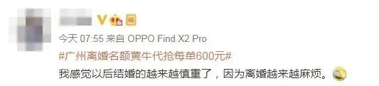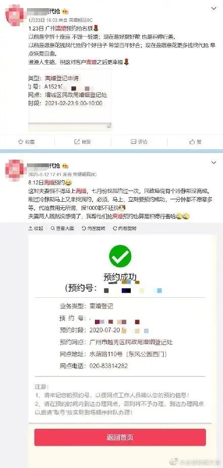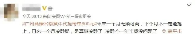 据中国新闻周刊,网络上还有黄牛提供离婚预约代抢服务。代抢商家称,600元可代替抢预约名额,未抢到可全额退款。