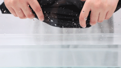 光说不练假把式,接下来我们拿出了满满一杯水泼到羽绒裤上,可以看到水珠圆润的滚落了下来,过后稍微擦拭一下就好了!