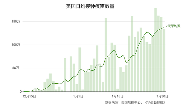 截至当地时间2月1日下午,美国至少注射一剂新冠疫苗的人数(2650万)已超过了美国的新冠病例确诊总数(2630万)。根据美国疾控中心(CDC)数据,截至当日,美国已完成注射的新冠疫苗数量超过了3222万剂。 据估算,相比两周前日均不到100万的接种量,过去一周平均每天的接种量已超过130万剂。