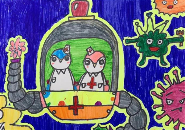 “蓬蓬戴上心爱的拳击手套,一阵痛击把丑陋的病毒打趴下了。病毒大哭着说:‘你等着,我还会回来的!’蓬蓬大声回答:‘有了防疫三件套,我才不怕你!’”