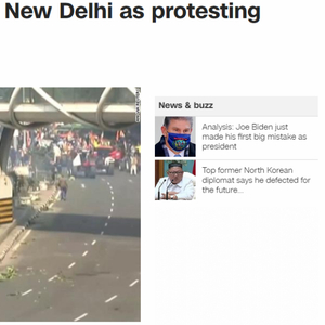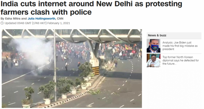 这条CNN新闻,正是关于印度农民抗议活动的最新进展,报道称,由于农民和警察发生了冲突,印度首都新德里已经切断了互联网。此外,报道还表示,印度封锁互联网的举动引发了西方对印度民主的担忧。