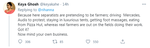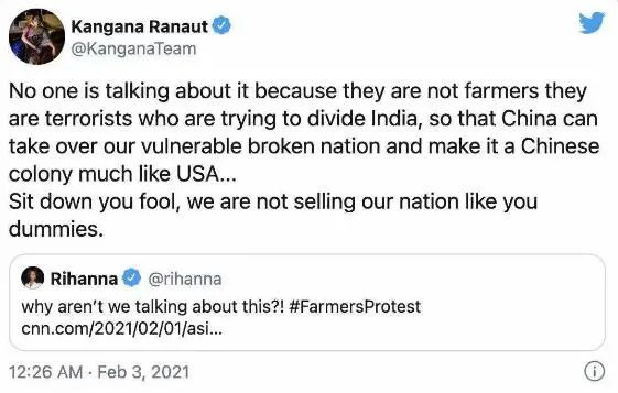 推文里,康格娜不客气地斥蕾哈娜“傻瓜”,直呼抗议者是“试图分裂印度的恐怖分子”,然后竟“阴谋论”称,这些“恐怖分子”这么做的目的,是好让中国“趁虚而入”……