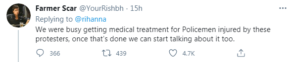最近印度农民轰轰烈烈的抗议活动,就引起了蕾哈娜的注意。