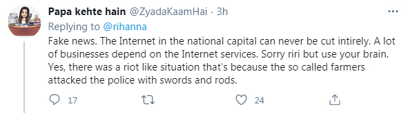 “假新闻,首都的互联网永远都不会彻底切断。许多商业服务都严重依赖互联网。对不起蕾蕾,但是请动动脑子,就是因为这些所谓的农民暴力袭击了警察,才导致了所谓的抗议和暴动。”