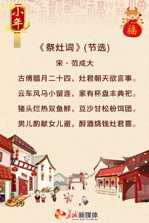 赏析:小年祭灶是大江南北共同的习俗。古人云:“民以食为天”,所以人们把灶王爷恭恭敬敬地奉为一家之主,这是完全可以理解的。这首诗就详细的描写了祭灶神的食物的丰富以及“男儿酌献女儿避”等民间传统。