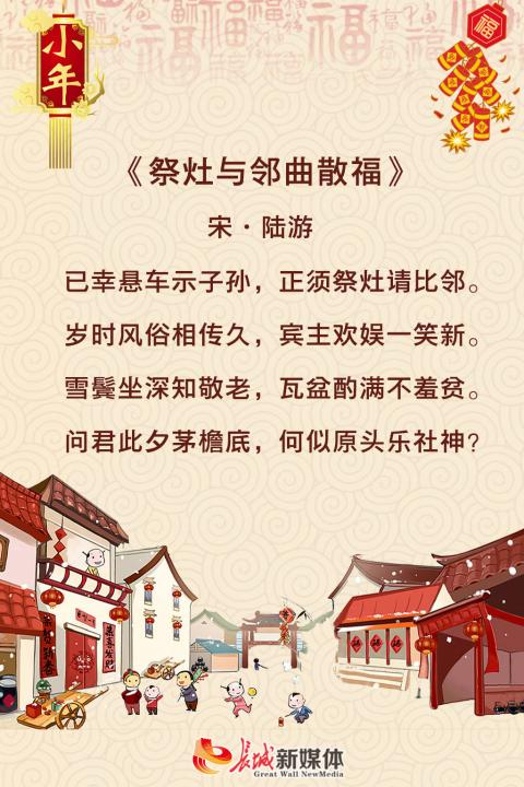 赏析:在小年这一天,陆游将左右邻居请来一起宴饮,这种风俗相传已经很久了。宾主相坐,欢声笑语不断。陆游在诗中还说,什么时候都要敬老,不因为家贫就感到羞愧。现在我们虽然住的是茅草房子,但和那灶头开心灶神何其相似呢?