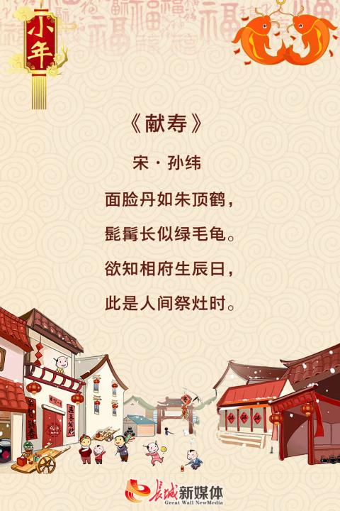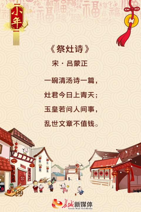 赏析:在小年这天祭灶是一项在汉族民间影响很大、流传极广的传统习俗。因为过一天之后灶神要上天去拜见玉帝,所以要好好恭送灶神上天,求他上天多言好事,带回吉祥。这首诗前二句写了灶神的相貌,后二句写了祭灶的活动。