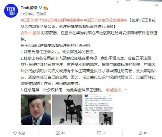 原标题:冲上热搜!任正非向全体员工道歉:华为注册姚安娜商标 “公权私用”