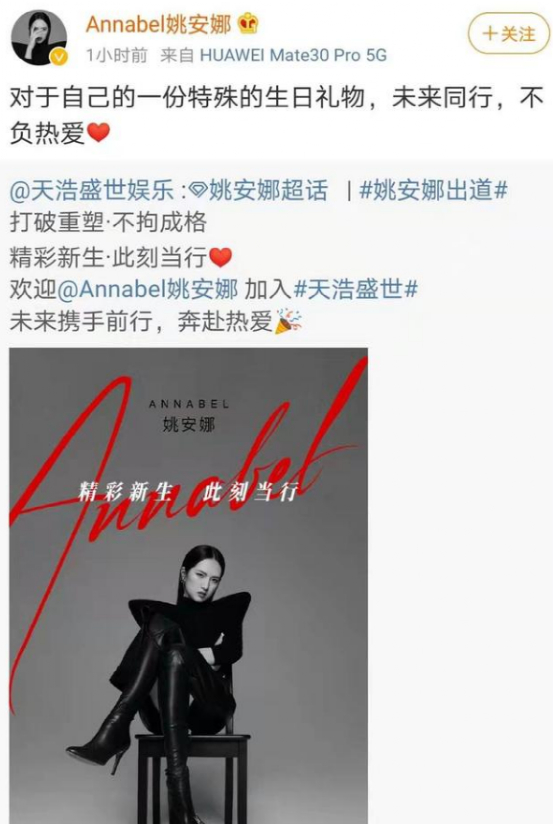 1月14日,天浩盛世娱乐官方微博发文宣布,姚安娜加入天浩盛世。姚安娜转发微博称,对于自己的一份特殊的生日礼物,未来同行,不负热爱。
