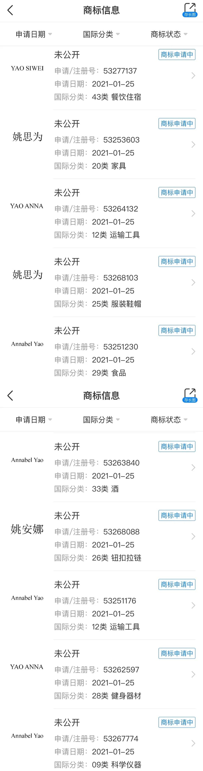 1月25日,华为技术有限公司申请注册“姚思为”、“姚安娜”、“YAO AIWEI”、“YAO ANNA”等商标,其中国际分类包含食品、珠宝钟表、通讯服务、餐饮住宿、健身器材、家具、医疗器械等,目前商标状态为注册申请中。