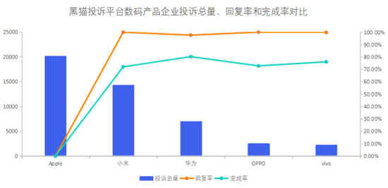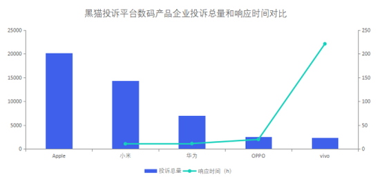 黑猫投诉发布数码行业主流企业投诉数据对比情况,数据来源为截至2021年2月3日企业在黑猫平台的投诉数据,其中企业主要投诉涉及产品为智能手机。