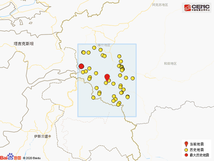 历史地震:根据中国地震台网速报目录,震中周边200公里内近5年来发生3级以上地震共139次,最大地震是2017年5月11日在新疆喀什地区塔什库尔干县发生的5.5级地震(距离本次震中176公里),按震级大小前50次历史地震分布如图。
