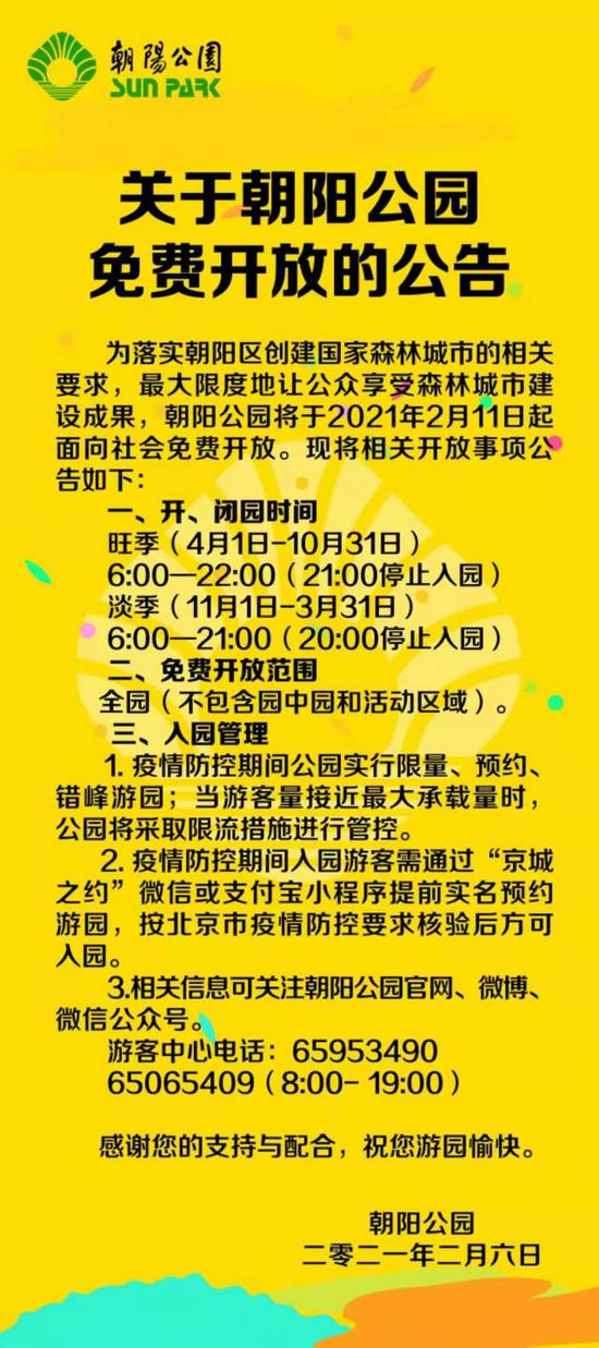 2月6日,朝阳公园发布消息,朝阳公园将于2021年2月11日起面向社会免费开放。疫情防控期间公园实行限量、预约、错峰游园。