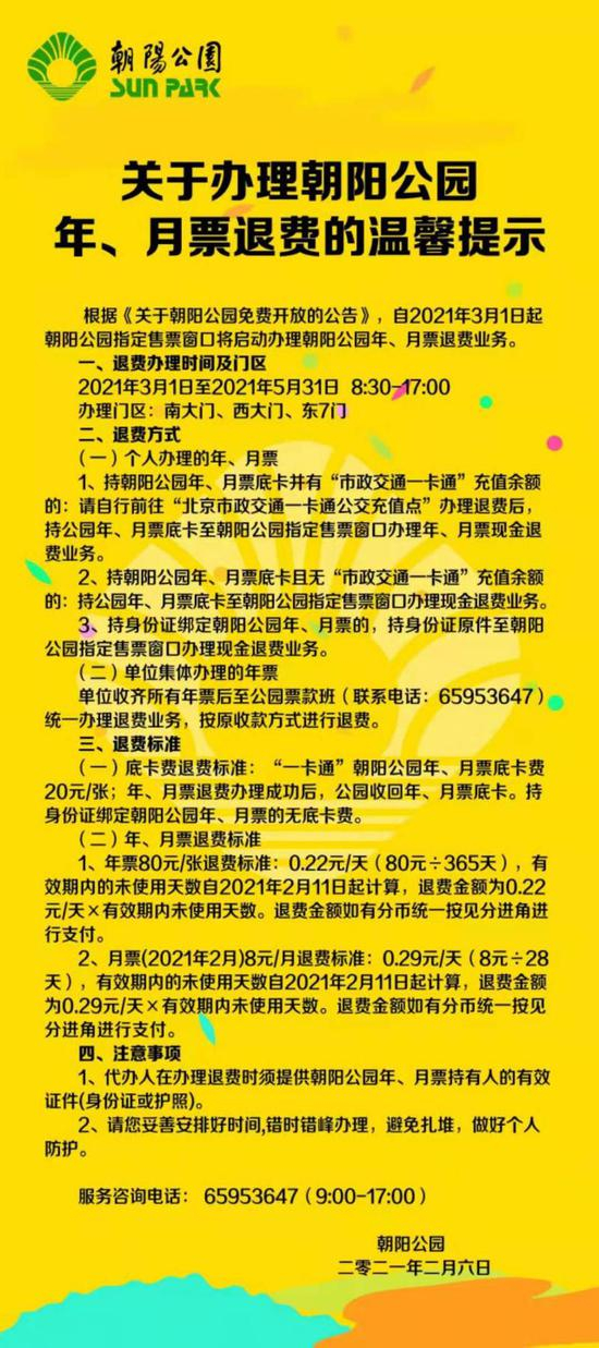 同时,自3月1日起,朝阳公园指定售票窗口将启动办理公园年、月票退费业务。