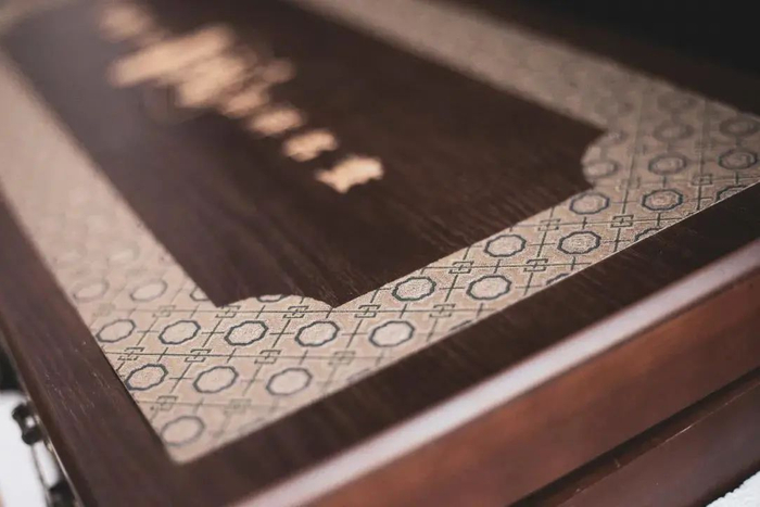 通身故宫泥土色,光泽润亮,四方周正有份量。正中央书“中国十大吉祥名画”字样,四周附有雕花装裱,朴拙中带着精致。