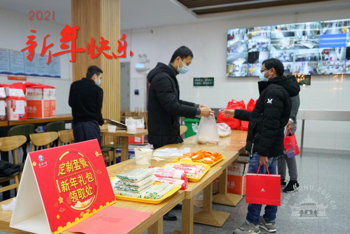 “丰富的年饭套餐和新年礼包,真有一种回家过年的味道。”2月9日中午,拿着团年饭和新年礼包,一位留校研究生高兴地说。