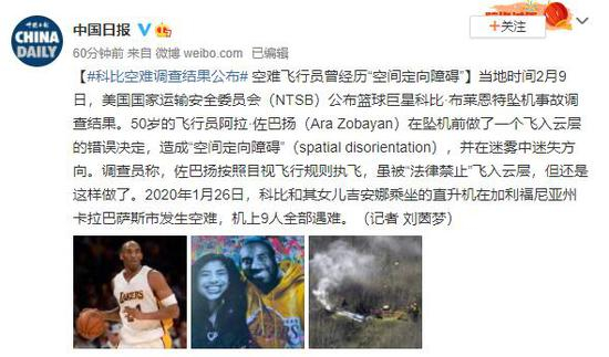 原标题:科比空难调查结果公布 空难飞行员曾经历“空间定向障碍”