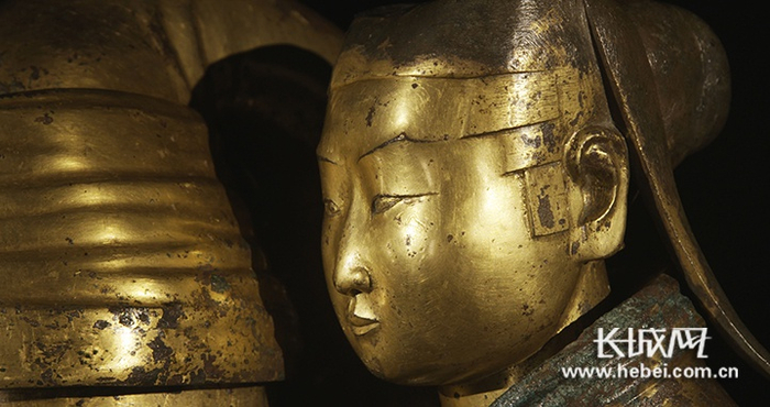 一位跪坐执灯的宫廷女子,面容清丽,头梳锥髻,衣纹疏密有致,衣领和袖口处多件衣物层次分明,她通体鎏金,宛若天成,闪耀着优雅端庄的动人气质,凝固了汉代宫廷的生活瞬间。