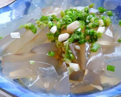 鱼鳞冻的制作很简单。将事先准备好的鲤鱼鳞,用水清洗几遍,然后放入锅里,倒水;小火熬煮,煮至鱼鳞打卷即可;把鱼鳞捞出来,鱼鳞水倒入盆中,在冰箱放一夜,第二天就成鱼鳞冻了。做好的鱼鳞冻晶莹透亮,颜色略显暗黄,有弹性。把它切成小块,放入蒜末、醋、生抽、盐,搅拌均匀,再把切碎的小葱撒在上面,一道美味的菜肴就做成了。