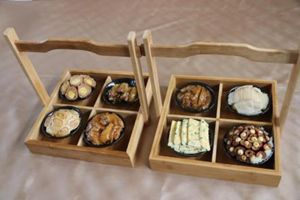 瓦块鱼、水乡松肉、红袍莲子、蒸面菜、酸菜扣白肉、三鲜鱼肉蛋卷、羊肉菜卷、虎眼丸子组成了“白洋淀八蒸碗”。该菜品以鲈鱼、五花肉、红枣、干莲子、黑鱼肉、猪肉馅、羊肉为主料,以糯米、果脯、青红丝、葡萄干等为辅料蒸制而成。这道菜品不仅看起来大方美观,品起来更是酱香浓厚,鲜味十足,白洋淀传统宴席的经典菜品,凝聚了白洋淀深厚的文化底蕴。