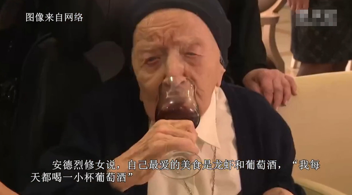 安德烈修女说,她最爱的美食是龙虾和葡萄酒,“我每天都喝一小杯葡萄酒”。