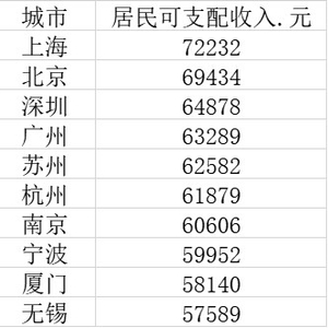 2020年我国人均收入最高的十大城市分别是上海、北京、深圳、广州、苏州、杭州、南京、宁波、厦门和无锡。其中,前7个城市人均收入超过了6万元。