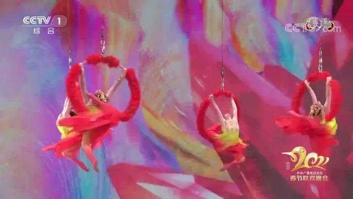 与往年让杂技以独立节目姿态进行展示不同,今年央视春晚对传统杂技中的特色技巧进行了全新创意编排,将杂技元素嵌入融合节目中——开场舞《万事如意》中,战士战旗杂技团的10位演员,犹如飞舞空中的花之仙子,展示“吊环”杂技特技,融入舞蹈元素,如梦如幻,绮丽唯美。