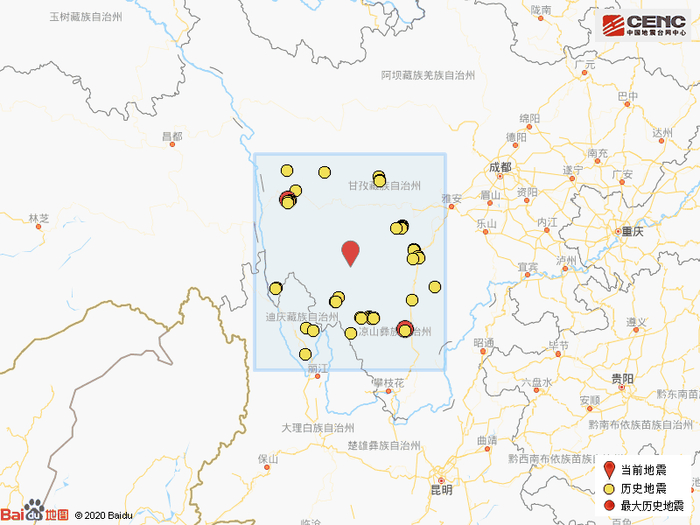 历史地震:根据中国地震台网速报目录,震中周边200公里内近5年来发生3级以上地震共71次,最大地震分别是2018年10月31日在四川凉山州西昌市发生的5.1级地震(距离本次震中185公里)和2016年9月23日在四川甘孜州理塘县发生的5.1级地震(距离本次震中176公里),按震级大小前50次历史地震分布如图。