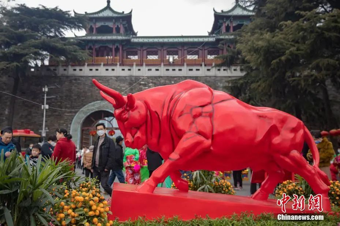2月12日,江苏省南京市,玄武门“大红牛”吸引民众驻足。中新社记者 泱波 摄