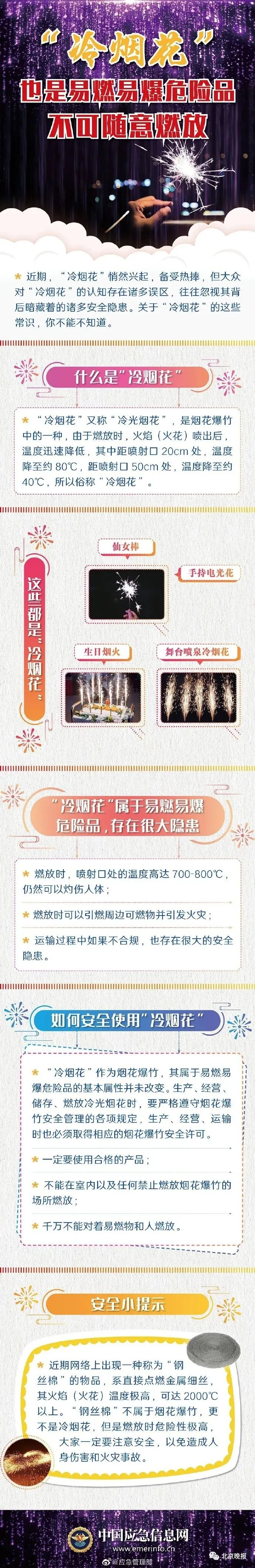 针对冷光烟花兴起的情况,国务院安委办、应急管理部强调,冷光烟花虽然火焰温度较低、烟雾较少,但喷射口温度仍高达700-800℃,可灼伤人体、引燃物品,作为烟花爆竹,其易燃易爆危险品的基本属性并未改变。生产、经营、储存、运输冷光烟花时,仍要严格遵守有关烟花爆竹安全管理的各项规定,必须取得相应安全许可,严禁以任何形式变相生产、销售。