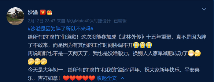 沙溢称,“给所有的‘腐竹’们道歉!这次没能参加《武林外传》十五年重聚,真不是因为胖了不敢来,而是因为有其他的工作,时间协调不开。”他还不忘调侃自己,“胖也不是一天两天了,我也是没啥毅力。换别人早减肥成功了。”