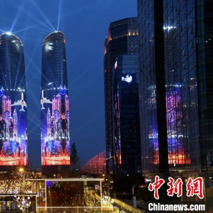 成都金融城双子塔外墙出现的城市和飞机画面。 刘忠俊 摄