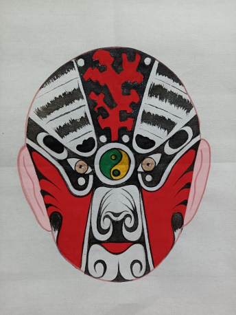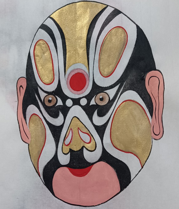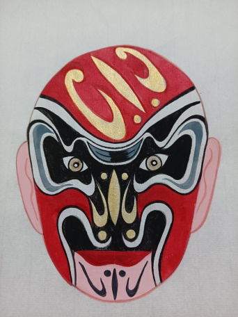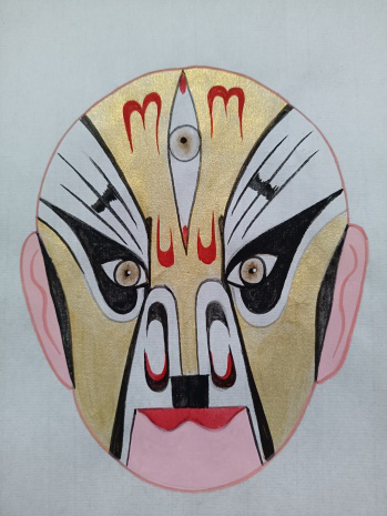 该脸谱出自传统剧目《牛郎织女》中的金牛神,该剧中金牛神和喜鹊仙一为牛郎织女做媒,二为牛郎织女七夕相会搭桥——皆为大喜之相,这次画出该脸谱以恭贺牛年好事多多,喜事连连!