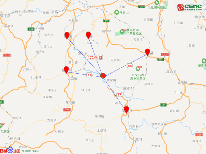 周边县城:震中距筠连县33公里、距云南威信县37公里、距珙县38公里、距兴文县44公里、距高县47公里,距宜宾市73公里,距重庆市232公里。