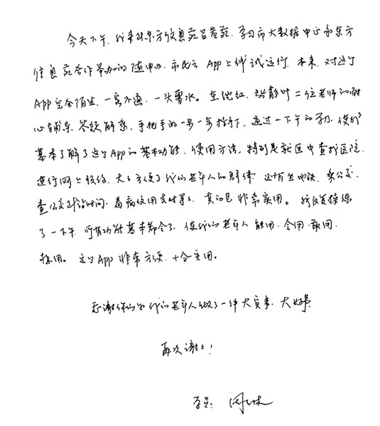 “本来对这个App完全陌生,一窍不通、一头雾水,在沈红、张静叶二位老师的耐心辅导下,我反复操作了一下午,所有功能基本都会了。”最近,家住金山区吕巷镇的周老伯参加了“一网通办”为老服务页面的运用辅导,学完后,专门手写了一封感谢信。信中,周老伯还点赞了随申办App“查找医院、进行网上预约、坐地铁、乘公交、查公交到站时间”等功能。