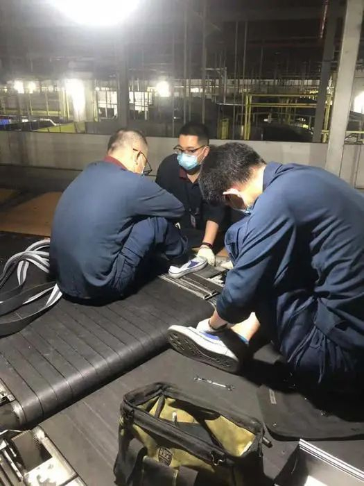 “咚咚咚”,钢结构平台上传来一阵阵脚步声,原来是机电保障部工作人员郭聪敏和2名班组成员上来了,在长达12公里,高度差8.6米,共计2000余台设备的地下钢铁长城里,他们扛着50斤重的驱动辊,手提工具箱来到了此前区域设备巡检时发现的驱动辊磨损处,由于故障处位于行李输送线干道上,为了不影响离港行李输送主流程,维修作业得在晚上11时之后离港航班结束后才能开展。