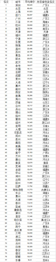 表:77个城市平均单价过万(来源:中国房价行情平台)