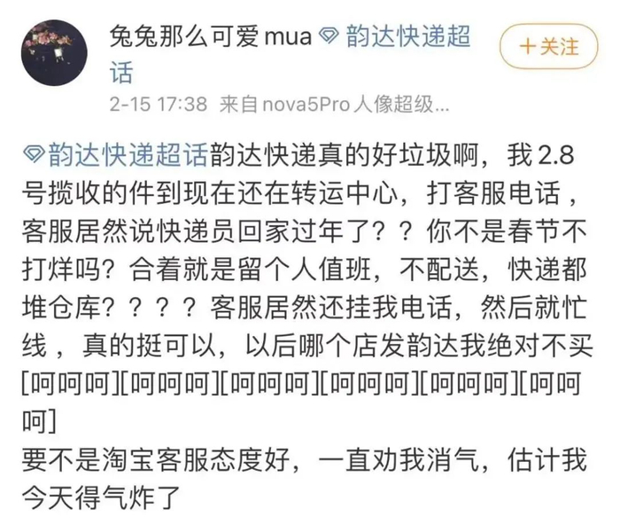 从微博、贴吧等社交平台可以看到,关于快递的投诉屡见不鲜。一位用户吐槽称,从网上购买了一件商品,由韵达快递负责配送,2月8日揽手后已经在转运中心滞留了七天,询问客服后,得到的回复是快递员回家过年了,无法配送。