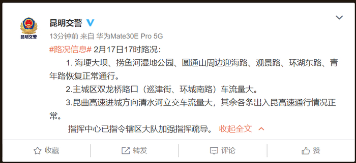 1. 海埂大坝、捞鱼河湿地公园、圆通山周边迎海路、观景路、环湖东路、青年路恢复正常通行。