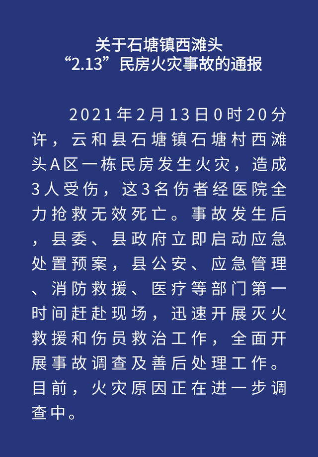 2月13日0时20分许,浙江丽水市云和县石塘镇石塘村西滩头A区一栋民房发生火灾,造成3人死亡。