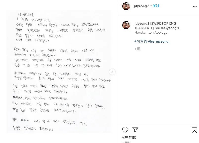 当地时间10日,李在英在个人社交媒体发布手写道歉信:“因为我过去的不成熟,曾经伤害了很多人,所以我要低头道歉。当我曾经留下美好回忆的时候,却有许多人被我伤害,这是不对的。”