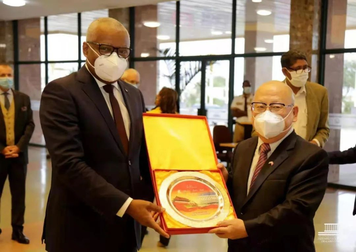 杜大使致辞表示,佛得角独立后第二年便与中国建立外交关系。自1976年中佛建交以来,两国关系顺利发展。佛得角议会大厦是中国首个重大援佛项目。中佛建交后不久,丰塞卡总统作为时任佛得角外交部秘书长参团访华,参与见证了该项目谈判过程。三年前,中国政府援助佛得角实施了议会大厦大修工程。议会大厦建成至今,在佛得角政治、社会和文化生活中发挥着重要作用,并成为中佛友谊的象征。今年是中佛建交45周年。相信中佛友好合作关系在新的历史起点将取得更大发展。杜小丛大使向桑托斯议长赠送了中国使馆特制的中佛建交45周年纪念盘。