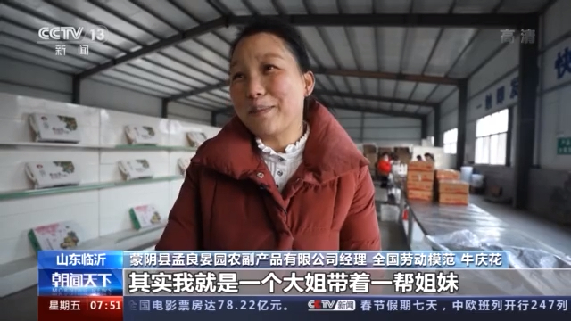 蒙阴县孟良晏园农副产品有限公司经理全国劳动模范 牛庆花:我就是一个大姐带着一帮姐妹,在这路上开始往前行。学习六姐妹,建功新时代,小康路上,姐妹同行。