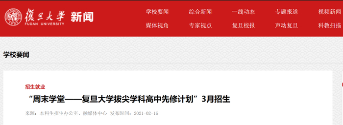 近日,复旦大学公布一项面向高一学生的项目——今年三月将开展面向上海市所有高中高一年级在读学生的“周末学堂——复旦大学拔尖学科高中先修计划”。