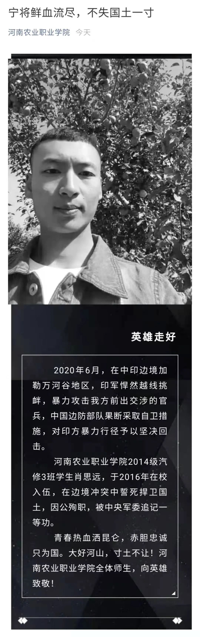 文中称,河南农业职业学院2014级汽修3班学生肖思远,在边境冲突中誓死捍卫国土,因公殉职,被中央军委追记一等功。青春热血洒昆仑,赤胆忠诚只为国。大好河山,寸土不让!河南农业职业学院全体师生,向英雄致敬!