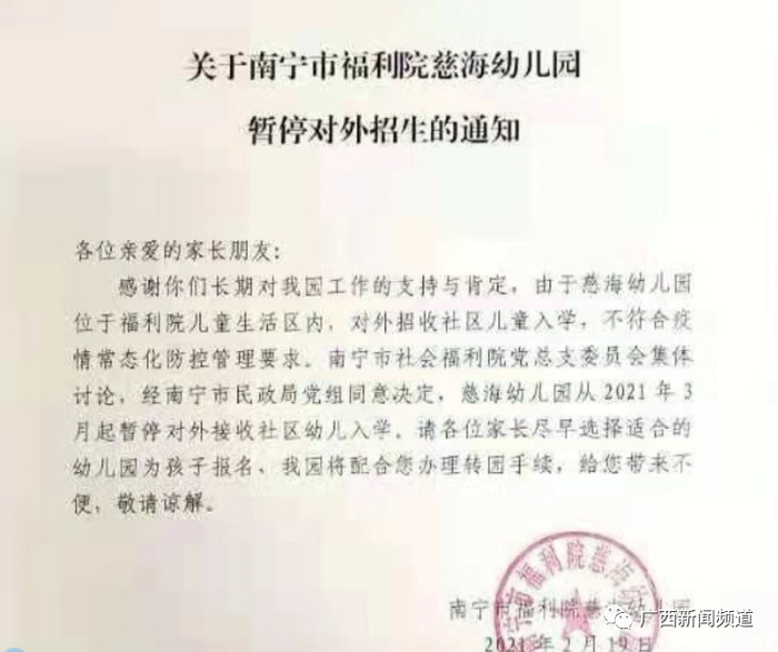 家长们向记者出示了一份园方在2月19日下发的通知,通知上说“由于慈海幼儿园位于福利院儿童生活区内,对外招收社区儿童入学,不符合疫情常态化防控管理要求,决定从今年3月起不对外接收社区幼儿入学”。