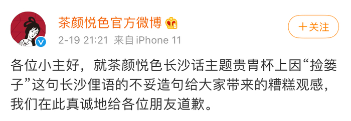 而就在“茶颜悦色侮辱女性”话题不断发酵之际,茶颜悦色官方微博先是于19日晚间紧急发布致歉声明,就长沙话主题杯上的“捡篓子”造句,进行说明道歉。