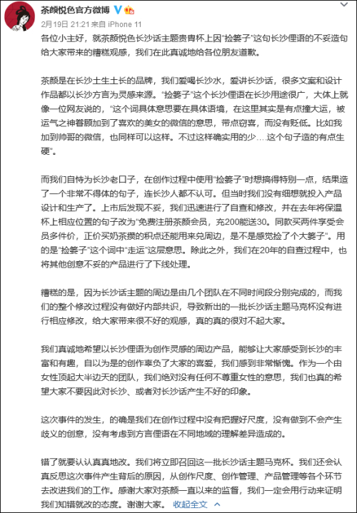 “我们很惭愧。”2021年2月19日晚,茶颜悦色在微博致歉,并表示将立即召回该批长沙话主题马克杯。