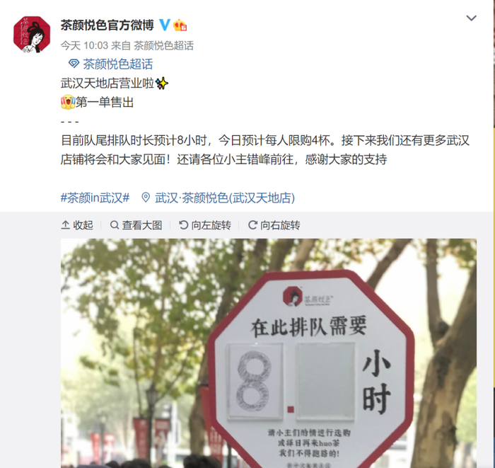 去年12月1日武汉首家茶颜悦色开业,奶茶店定于上午10时开业 ,8时店门口就排起长队,不少人还带着小板凳。