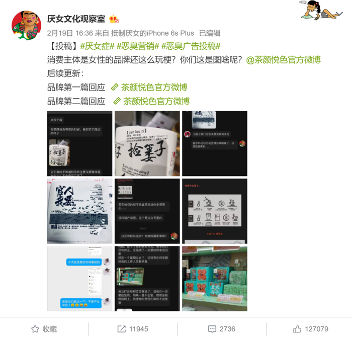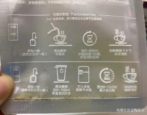 19日下午,博主@厌女文化观察室发出网友投稿截图,茶颜悦色的一款长沙话主题马克杯、一款茶包,以及就泡茶方式出的文案等,都被网友指涉嫌侮辱女性。